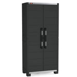 El armario alto Garage XL es apto para organizar espacios en cualquier tipo de contexto, se caracteriza por bisagras metálicas, tiradores de diseño y predisposición para el candado. Dispone de 4 estantes regulables reforzados con perfiles metálicos con una capacidad de 45 kg cada uno . Resistente al clima.