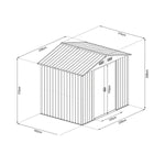 Caseta de jardín con techo a dos aguas, fabricada en chapa galvanizada y pintada (0,25 mm). No requiere mantenimiento, es resistente a la intemperie ya los cambios bruscos de temperatura. Perfecto para guardar herramientas de jardín. Puerta con dos puertas correderas. Piso no incluido. Dimensiones exteriores: 236x174 - H. 206 cm