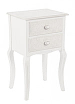 Cómoda de madera blanca de 2 cajones Clorine Detalles técnicos: mdf estantes y frentes con motivos florales incrustados. Acabado con pintura al agua mate. mangos de poliresina. Medidas: 41 cm de largo 33,5 cm de...