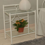 Mesita de noche de hierro forjado blanco satinado Silene Elegante mesita de noche de hierro forjado con dos baldas de cristal. Características: Hierro forjado. Color blanco satinado. Medidas L 52 x P 35x72 H cm....