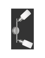 La lámpara de techo MARS de Trio Lighting tiene una estructura de metal en color níquel mate compuesta por una base redonda, un brazo lineal y 2 focos orientables con tulipas cilíndricas de cristal blanco.