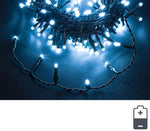 Cadena 180Led, Luz Blanca, Tamaño Led 5Mm No Sustituibles. Cable Verde. Longitud Total del Cable 9,25Mt, Longitud del Cable de Alimentación 0,3Mt, Longitud del Cable de Luces 8,95Mt, Distancia entre Led 5Cm. 8 Juegos de Luz con Memoria. Temporizador Encendido-Apagado 6/18 Horas. Para Uso Interior-Exterior Ip44. Con Caja de Color. Funciona con Pilas 3Xaa No Incluidas.