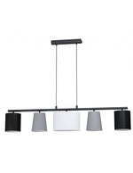 La lámpara de suspensión de la marca EGLO, modelo ALMEIDA, tiene un diseño con balancín de metal negro y 5 difusores de tela de varias formas y tamaños, disponible en blanco, negro y antracita.