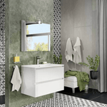 Mueble de baño suspendido, equipado con dos cajones de 80 cm con cierre suave. El fregadero es de cerámica. El espejo está incluido en el precio.