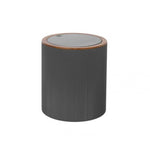 Contenedor gris de 5 litros de capacidad. El objeto tiene un diseño extremadamente contemporáneo y minimalista. La papelera tiene un acabado en color gris y un efecto de madera marrón en la parte superior. Se recomienda manejar la abertura con cuidado para evitar daños.