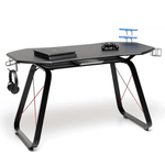 Escritorio con estructura de acero pintado de negro, sobres de MDF color carbón, balda inferior, accesorios para joystick, auriculares, refrescos y módem. Dimensiones totales 145x65xH89 cm