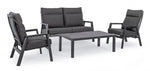 Estructura de aluminio con recubrimiento de polvo (poliéster). Respaldo reclinable en posición libre y asiento en textileno 1x1. cojines con funda desenfundable en tejido olefina (100% polipropileno).