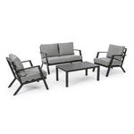 Salón Harley antracita Aluminio con recubrimiento en polvo (poliéster). Cojines de asiento y respaldo desenfundables en tejido olefino (100% polipropileno). pies ajustables. tornillos de acero inoxidable. Dimensiones: Sofá: Longitud: 127cm Profundidad: 81,5xm Altura: 76cm Sillón:...