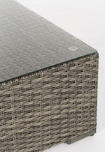 estructura de aluminio, con recubrimiento de polvo (poliéster), tejido de fibra sintética. tapa de cristal templado. pies ajustables.