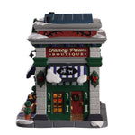 La ventana iluminada muestra los excelentes productos para mascotas de la tienda, mientras que en el porche delantero se exhiben aún más camas y juguetes.
