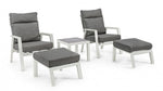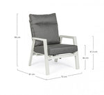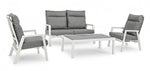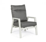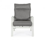 Estructura de aluminio con recubrimiento de polvo (poliéster). Respaldo reclinable en posición libre y asiento en textileno 1x1. cojines con funda desenfundable en tejido olefina (100% polipropileno).