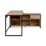 Este escritorio esquinero ofrece un amplio espacio para trabajar y organizar sus documentos y suministros. Los estantes le permiten tener todo al alcance, mientras que el cajón y el compartimento abierto ofrecen espacio adicional para guardar objetos de valor o personales.