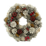 Corona nevada con manzanas ø30h7,5 cm Características: Material:MADERA el color blanco Estructura de poliestireno recubierta de piñas y objetos de plástico