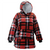 Este suéter tiene un patrón de cuadros en rojo, negro y blanco.