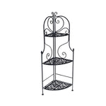 La estructura es angular en metal, con 3 estantes de estilo rústico. Se caracteriza por un color negro y decoraciones con rizos.