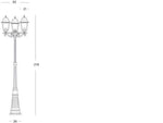 Palo de aluminio fundido. Difusores de vidrio transparente. Altura máxima de la lámpara: 210mm. Triángulo de fijación al suelo. Alimentación 230 V ~ 50 Hz. Clase de protección: IP43. Número de lámparas: 3. Potencia máxima de las lámparas: 100W.