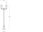 Palo de aluminio fundido. Difusores de vidrio transparente. Altura máxima de la lámpara: 210mm. Triángulo de fijación al suelo. Alimentación 230V ~ 50Hz. Clase de protección: IP43. Número de lámparas: 2. Potencia máxima de las lámparas: 100W.