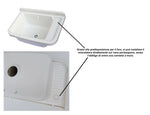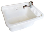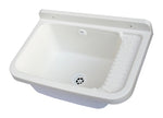 Lavandino-pilozzo a muro in resina P.P. Stampaggio a iniezione, resistente a tutti gli acidi di uso domestico, e agli agenti atmosferici. Sifone a 1 via, piletta troppopieno, tasselli per fissaggio a muro inclusi nella confezione. Idoneo per installazione sia all'interno che all'esterno (garage, terrazzi, giardini e locali umidi in genere) dimensioni cm 59x39x28 h. Articolo made in Italy.