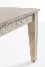 Madera de mango, pintura de nitrocelulosa con boscópicos blancos claros. Decoración con incrustaciones hechas a mano. piernas para ensamblar.