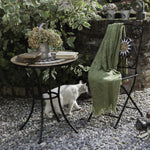 Fabricada en metal pintado con motivo de mosaico en los respaldos.