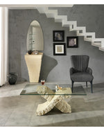 MATERIALES: Tapa: Cristal templado canto pulido Patas / Base: Piedra fósil ágata blanca Estructura de las patas: Contrachapado marino